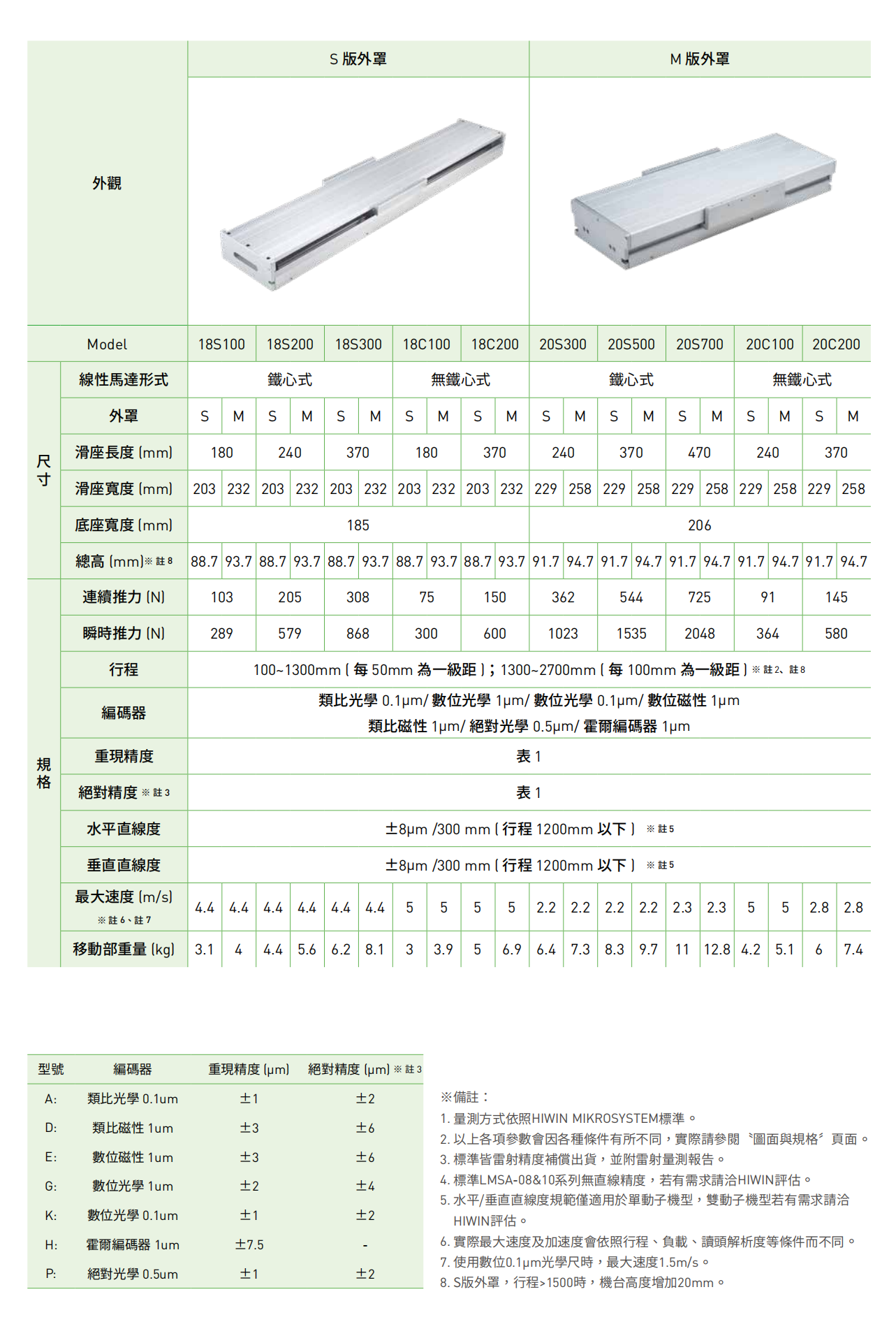 HIWIN单轴直线电机模组在同级别宽度产品中拥有:最大推力、规格多样化、高密封款 (适用于Class100环境) 等特色,搭配HIWIN自主研发E1高阶驱动器拥有智能化免调适、低速度链波、短整定时间、真龙门双驱同动、位置触发 (PT/PEG) 等内建标准功能,以及2D补偿的进阶驱动器选配方案。